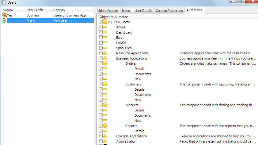 フレームワーク・オブジェクトの隣にあるチェックボックスで、このグループによる権限がないものでも、チェックが入っていることに注目してください。このユーザー (Frank) は、これらのオブジェクトを使用する権限が許されることが可能ということです。