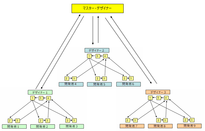 アプリケーションのコンポーネントは各チームによって作成されるため、デザイナーはマージ・ツールにより新規作成および更新されたコンポーネントのマージ・リストを作成します。このリストはマスター・デザイナーに送信され、マスター・フレームワークにマージされます。この後、新しいマスター・フレームワークは各デザイナーに送り返され、各チームの次の作業の基礎となります。