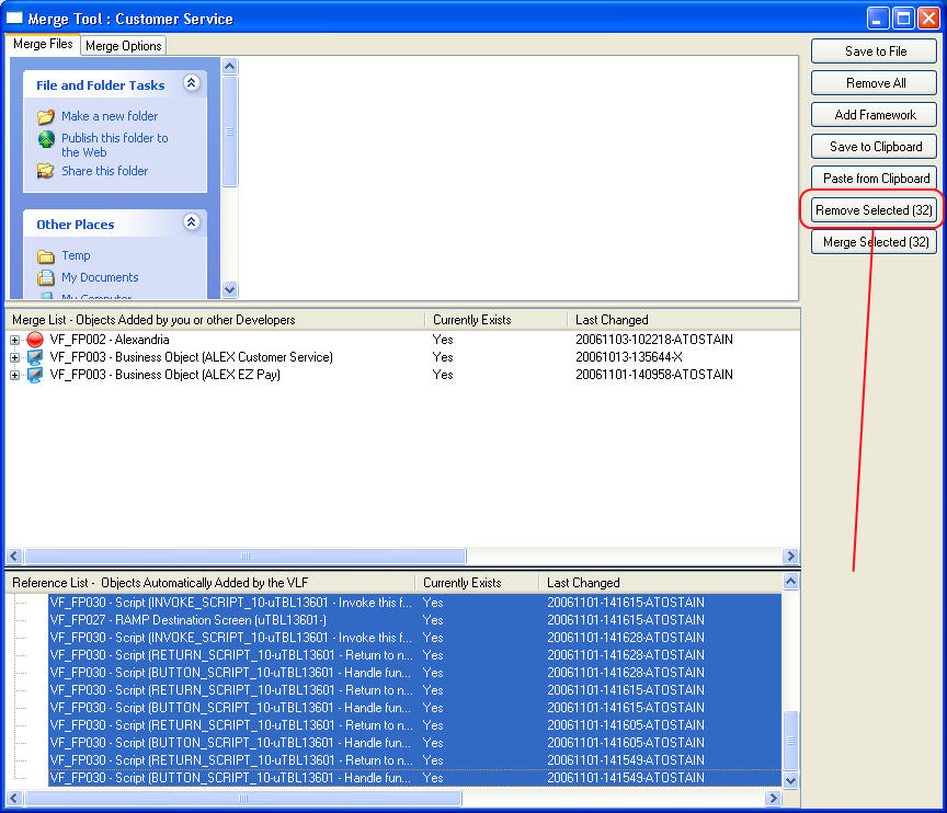 しかしここには、実際には必要ないオブジェクトもあるかも知れません。 不要なスクリプトを削除する一方、ここにはなくても実際には必要なものがあれば手動でコピーします。 不要なスクリプトを選択し、選択された項目を削除ボタンを押してください。