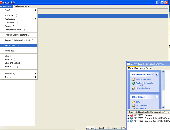 マージしようとするビジネス・オブジェクトを、フレームワーク・ウィンドウから、中央パネルにあるマージ・リスト上にドラッグ移動してください。 この例ではAlexandriaを移動しています。