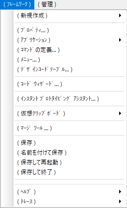 フレームワークのフレームワークメニューと管理メニュー、およびそのオプション・メニューは、フレームワークがユーザー・モードで実行されている場合、エンドユーザーには表示されないため括弧で括られています