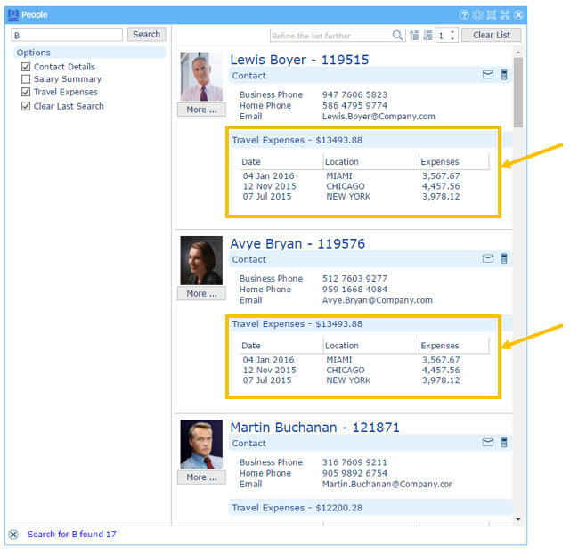 例えば、提供されている VLF-ONE デモでは社員と経費間のデータベースの親子関係は次のような連絡先カード・スタイル・リストでビジュアライズされています。