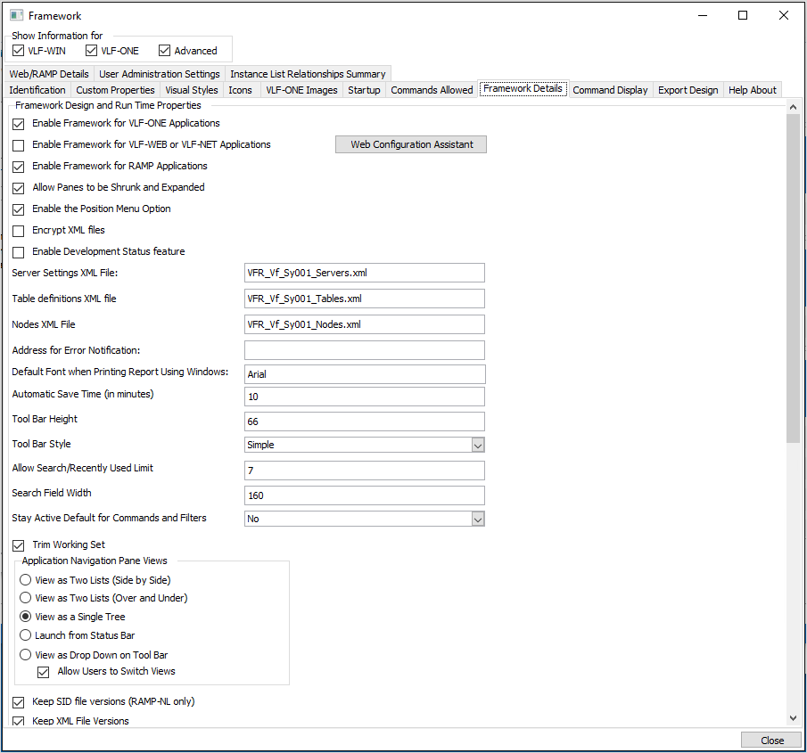 フレームワーク全体のオプションを設定するには、このタブを使用します。エラー報告のアドレスペインの拡大/縮小を許可最近使用したオブジェクトの保存数ツリー/リストの切り替え可能自動保存のタイミング(分単位)Windows印刷の省略時のフォント開発ステータスのキャプション開発ステータス機能を有効にする位置メニュー・オプションの有効化XMLファイル の暗号化アイコンとビットマップの登録サブフォルダ内のバージョンを保持XML ファイルのバージョン保持ステータス・バーからの起動MTXT ストリング ローダーノード XML ファイル検索欄の幅サーバー設定のXMLファイルコマンドとフィルターの常にアクティブの省略値テーブル定義XMLファイルツールバーの高さツールバー・スタイルワーキングセットのトリムユーザー定義インターフェース・ポイントツリー表示ツールバーに表示2つのリストを表示(上下)リスト表示
