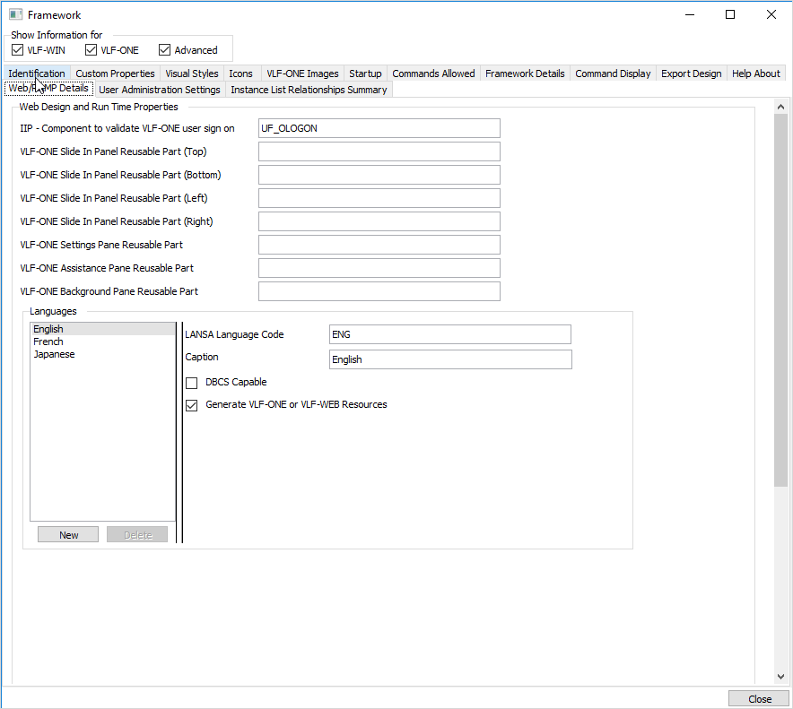 Webアプリケーションのデザインと実行時のプロパティを設定するには、このタブを使用します。列キャプションDBCS 対応VLF-ONE または VLF-WEB のリソース生成言語LANSAの言語コードRAMP JavaScript CharsetVLF-ONE アシスタント・パネル再利用可能パーツVLF-ONE 背景パネル再利用可能パーツVLF-ONE 設定パネル再利用可能パーツVLF-ONE スライドイン・パネル再利用可能パーツ(上、下、左、右)Windows コードページ