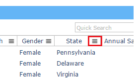 この可能な値のリストは、ユーザーが列フィルターのアイコンをクリックしたときに列のコンテンツ (表示・非表示の両方) から作成されます。 この検索は、別の列やクィック検索などのその他の検索とは関係なく独立しています。