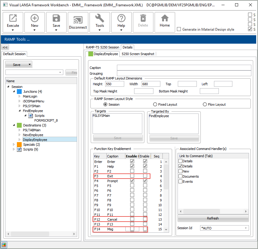 フレームワークではマウスを数回クリックするだけで移動できるため、このステップでは、ナビゲーションで使用する5250キーを無効にします。このため、ナビゲーション目的で使用されるファンクション・キーとボタンは不要になります。