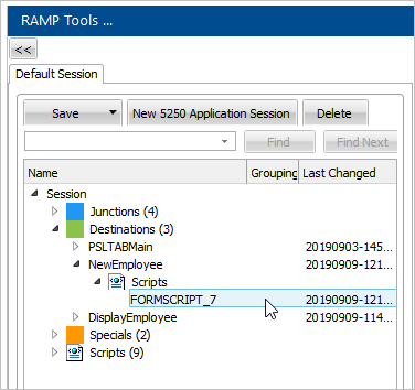 - RAMP ツール・ウィンドウで、NewEmployee 画面のスクリプトを見つけます。