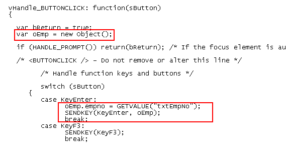 oEmp.empno = GETVALUE("txtEmpno"); - SENDKEY ファンクションを変更して、社員番号ペイロードを渡します。
