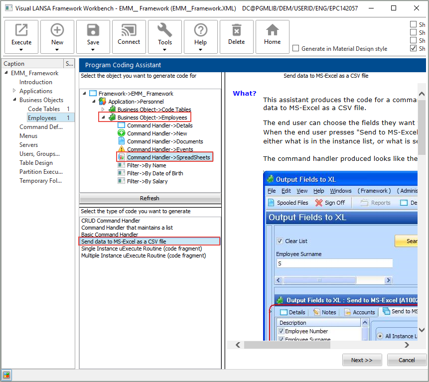 - Employees ビジネス・オブジェクトおよび Spreadsheets コマンド・ハンドラーを選択します。