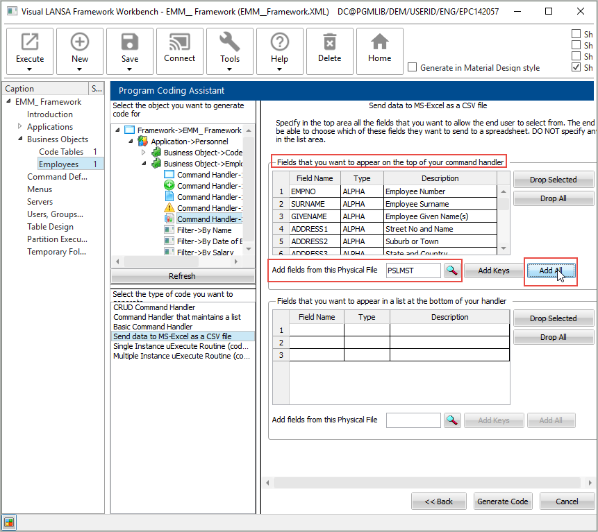- コマンド・ハンドラーの上の部分で PSLMST ファイルのすべてのフィールドを含めるように選択します。