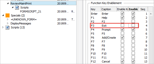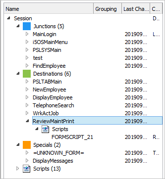 画面とスクリプトのリストで、ReviewMaintPrint の 1 つの画面定義とそれを制御する 1 つのスクリプトがあることを確認します。