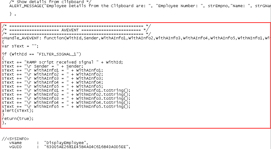 このステップでは、FILTER_SIGNAL_1をリッスンするように、また通知を受け取ったときにメッセージを表示するように、DisplayEmployee画面に関連付けられているスクリプトを変更します。