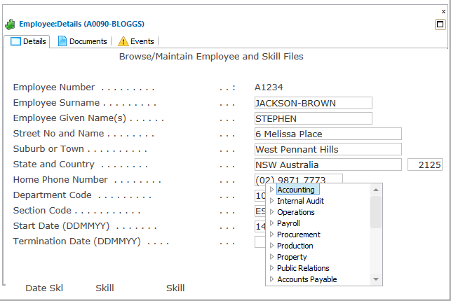 8. [部門コード] フィールドで F4 を押します。5250 プロンプタが表示されます。