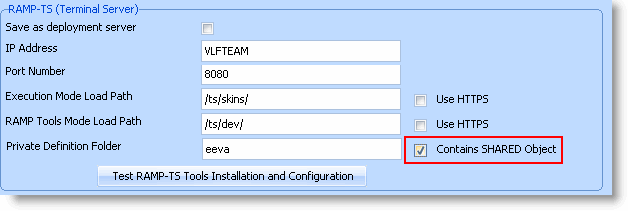 - フレームワークの [サーバーの詳細] で、[RAMP-TS (ターミナル サーバー)] グループ・ボックスの [共有オブジェクトを含む] オプションをオンにし、SHARED オブジェクト・ファイルがプライベート定義フォルダにあることを RAMP-TS に示します。