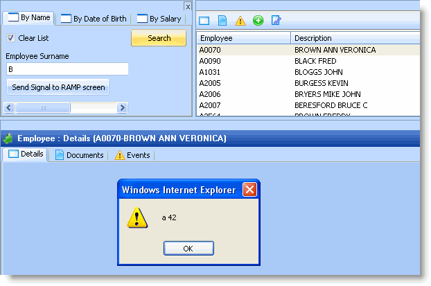 - 変更をコミットし、部分保存を実行します。次に、社員の詳細を表示して到着スクリプトを実行します。以下のようなメッセージ・ボックスが表示されます。