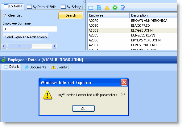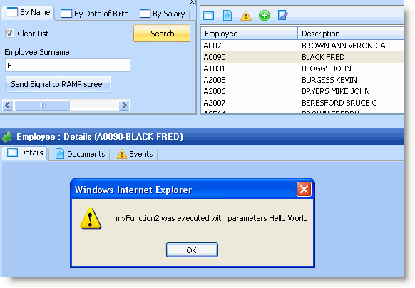 SHARED.myFunction1("1",2,"3"); - 変更をコミットし、部分保存を実行します。次に、別の社員の詳細を表示します。以下のように別のメッセージ・ボックスが表示され、SHARED オブジェクトで myFunction1 ファンクションを実行したことが示されます。