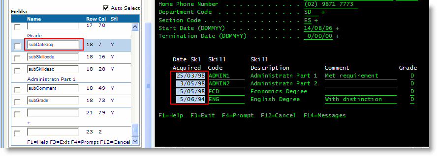 スキル・テーブルのサブファイル列にも名前を付ける必要があります。 - 取得日 (DDMMYY) の (列の見出し ではなく) 列を選択し、subDateacq という名前を付けます。