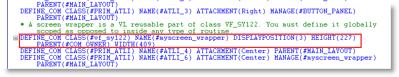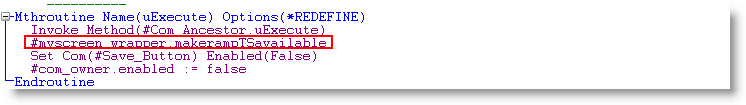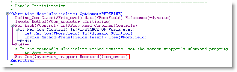 - 次に、uInitialize イベント・ルーチンで、画面ラッパーの uCommand プロパティを #COM_OWNER に設定するステートメントに注意します。