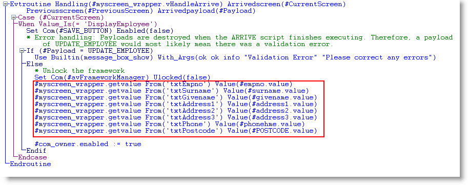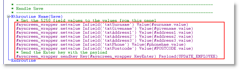 - 画面ラッパー上の [保存] ボタンを処理するイベント・ルーチンを確認します。このイベント・ルーチンは、ラッパーフィールド上の値を画面上のフィールドに割り当て、次に Enter キーを押す処理をエミュレートします。