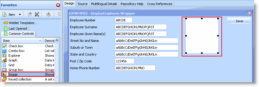 - イメージ・コントロールを [お気に入り] の [共通の制御] タブから画面にドラッグします。