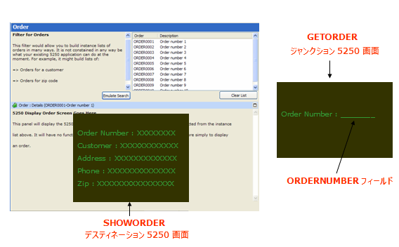 1 番目の画面 GETORDERは、受注番号の入力を要求し、2 番目の画面 SHOWORDER は、受注の詳細を表示します。
