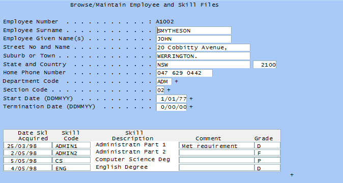 次のサンプルでは、プロセス PSLSYS ファンクション INQUIRE として LANSA に組み込まれている 5250 デスティネーション画面を使用します。これを使用すると、社員の詳細を表示、更新できます。最初は、次のような到着スクリプトが含まれています。