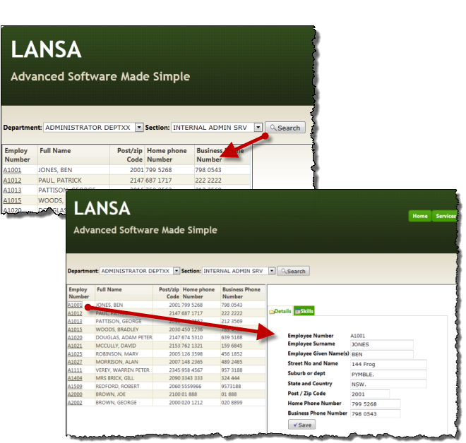 • A Save button on each tab page enables employee details or skills to be updated.