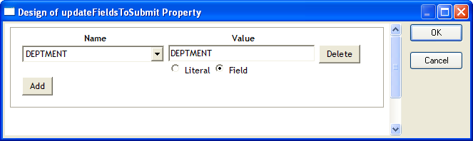 Complete the updateFieldsToSubmit property by clicking on the Ellipsis button in the value column, to open the Design of… Property dialog.- Select DEPTMENT in the Name column.
