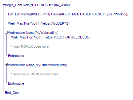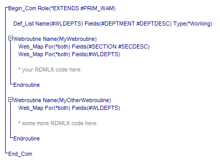 以下のグローバルWebマップの例では、WLDEPTS作業リストのWebマップの位置に注意してください。コンパイル時、MyWebroutineMyOtherWebroutineの両方がこのWebマップを採用します。また、MyWebroutineは独自のローカルのWebマップも持っています。