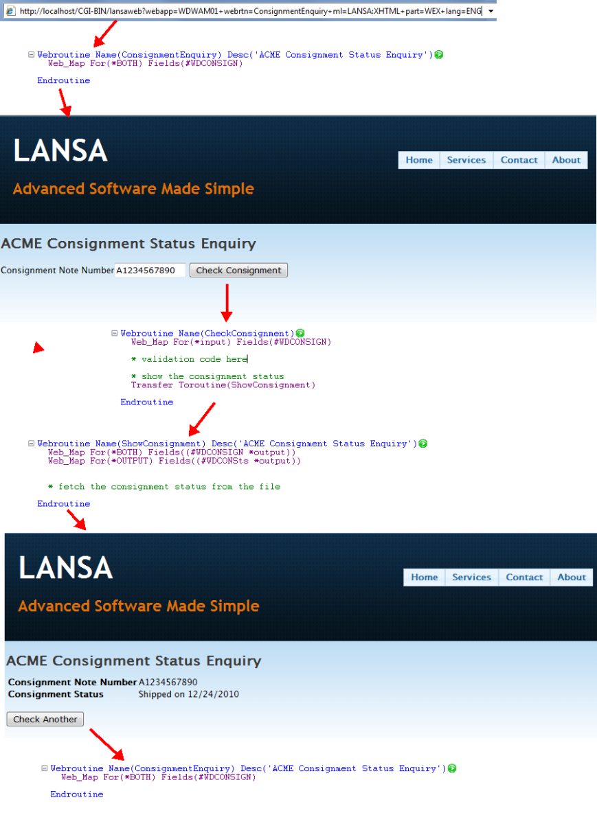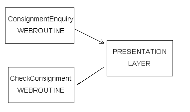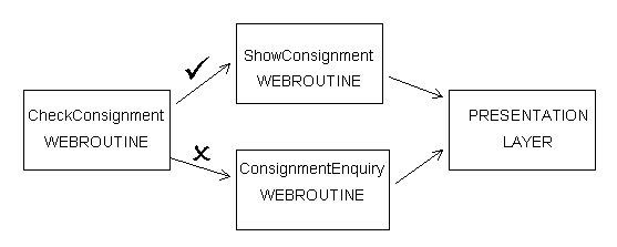 CheckConsignment Webroutine は永久に最後に達しないので、ウェブ・ページを表示することはないということに注意してください。常に、ShowConsignmentまたは ConsignmentEnquiry Webroutine のどちらかにコントロールを移します。