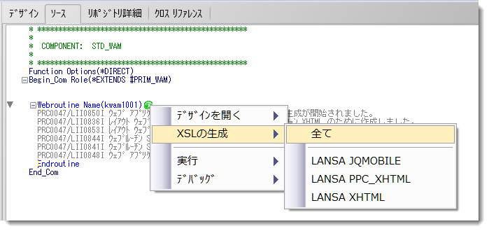 その後の段階で異なるテクノロジ・サービスのXSLを生成したくなった場合は、Webroutineデザイン・グリフを右クリックして[XSLの生成]を選択し、必要なテクノロジ・サービス・プロバイダを選択することで可能になります。