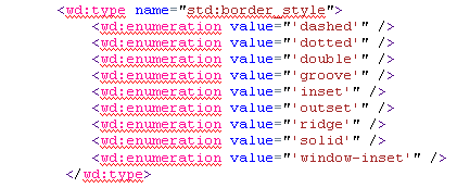 このタイプstd:border_styleを参照するウェブレットのプロパティはいずれも境界線のスタイルに関連するもので、wd:enumerationステートメントの値が有効値として含まれることは、このタイプ定義から簡単に推測できると思います。
