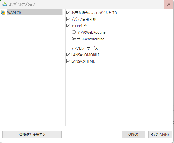 選択されたコンパイル・オプションは、後に行われるコンパイルのために保持されますが、XSL生成についてはその限りではありません。XSL生成は安全策として、常に新しいWebroutineのみを生成するよう設定されています。