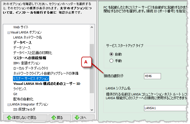 - [リスナー サービス オプション] を選択して、TCP/IPポート番号、つまり図の A の印がある [接続の識別子] の値を確認します。