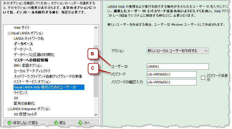 - [Visual LANSA Web 構成のためのユーザー ID] を選択して、図に示された B と C の値を確認します。