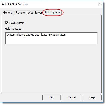 LANSAシステムを保留にする場合は、\[システム保留\] を選択します。ユーザーは、保留中のLANSAシステムにはアクセスできません。