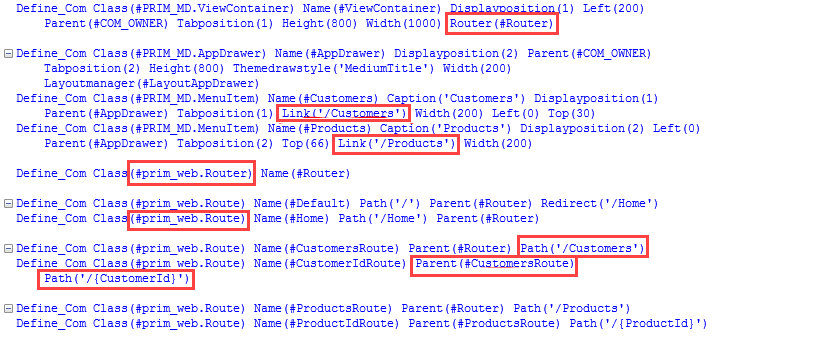 The parent property of the #PRIM_WEB.Route class forms a tree of routes where the FullPath of a route is derived from the FullPath of its parent and the route owns the Path string as highlighted below: