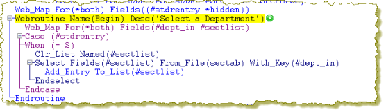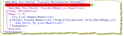 e.  With a valid department such as ADM or AUD entered, click the Select button. Focus will return to the WebRoutine statement for Begin in the editor and it will be highlighted in yellow as before.