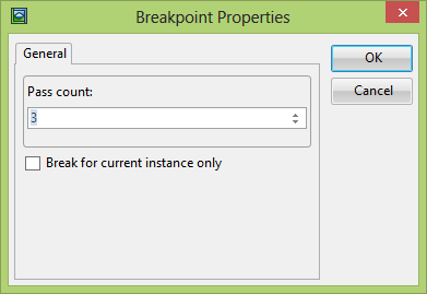 Use the right mouse menu and select Breakpoint Properties, and set the pass count to 3 and press OK.