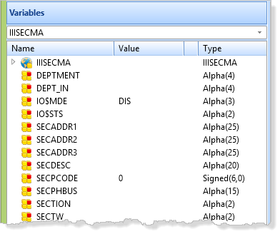 b.  When focus returns to the LANSA Editor, expand the SECT_LIST entry in the Variables tab.