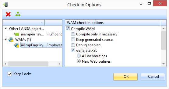- Your new WAM is locked to a Task Id. Usually this will be the Task Id you selected when you logged in the Visual LANSA. The lock is applied using your PC Name. If you select the Keep Locks option shown in the Check In Options dialog, Visual LANSA will keep the WAM locked using Task Id and PC Name and you could continue developing the WAM. See the Visual LANSA Administrator's Guide for further details on this subject.
