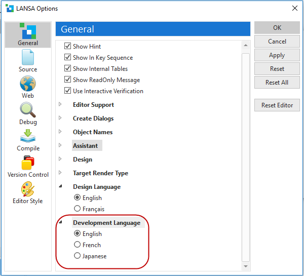You can select the language used for all Visual LANSA dialogs, menus and messages the next time you log on. The development language can only be one of the languages Visual LANSA is enabled for.
