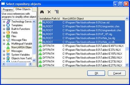 Add newlook objects | Add all of the files from the root of your newlook directory (usually C:\Program Files\looksoftware 8.0) to the list of Non-LANSA Objects within your package. Also add all of the files from the newlook Tables directory (C:\Program Files\looksoftware 8.0\Tables). Do not include objects from any other newlook subdirectories. | Click on the Objects button from the Deployment Tool bar. Then double-click on Non-LANSA Objects on the Other Objects tab. Locate the looksoftware 8.0 directory and select all the objects in the directory. Repeat the steps to include all the files in the looksoftware 8.0/Tables directory. If you have added other files to the looksoftware 8.0 directory that are specific to your RAMP-NL application, add them as well. For example if your users will be using printer emulation sessions, add all the .nlp files from the Printers directory. |