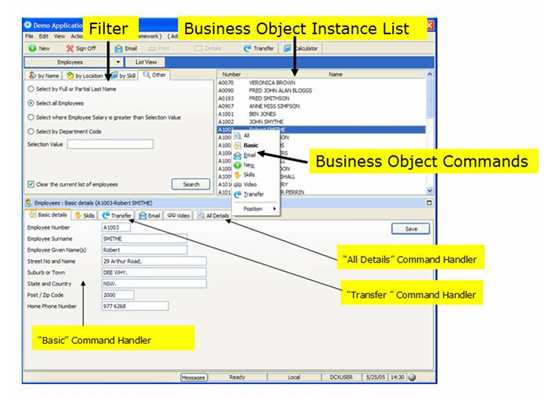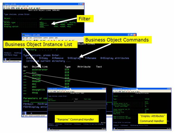 The basic Framework concepts of business objects, filters and command handlers (screens) can be visualized in a IBM i application like this: