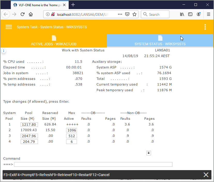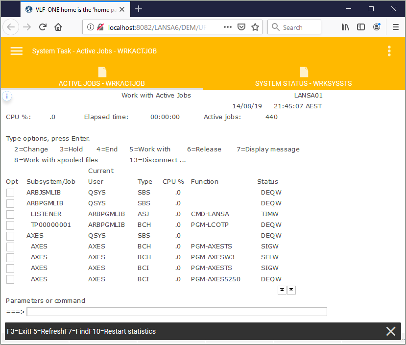 Refer to Step 9. Execute the VLF-ONE Application to launch the Framework as a VLF-ONE application, sign in and execute System Tasks, then WRKACTJOB.