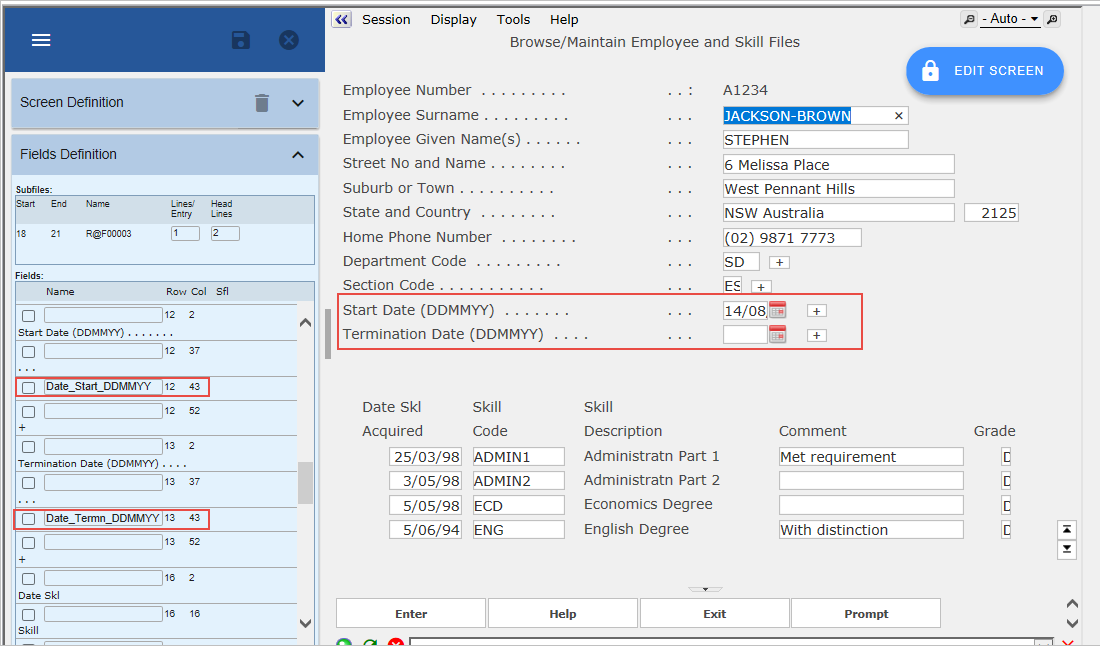 7. Display the details of an employee and prompt for the Start Date and Termination Date fields. The special field handler DF_PRM07 is displayed for both fields (and for any other field named Date_nnnnnn_ffffffff).