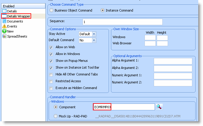 6. Create a new command Details Wrapper, enable it for the Employees business object and associate the iiiRMP03 screen wrapper with it.