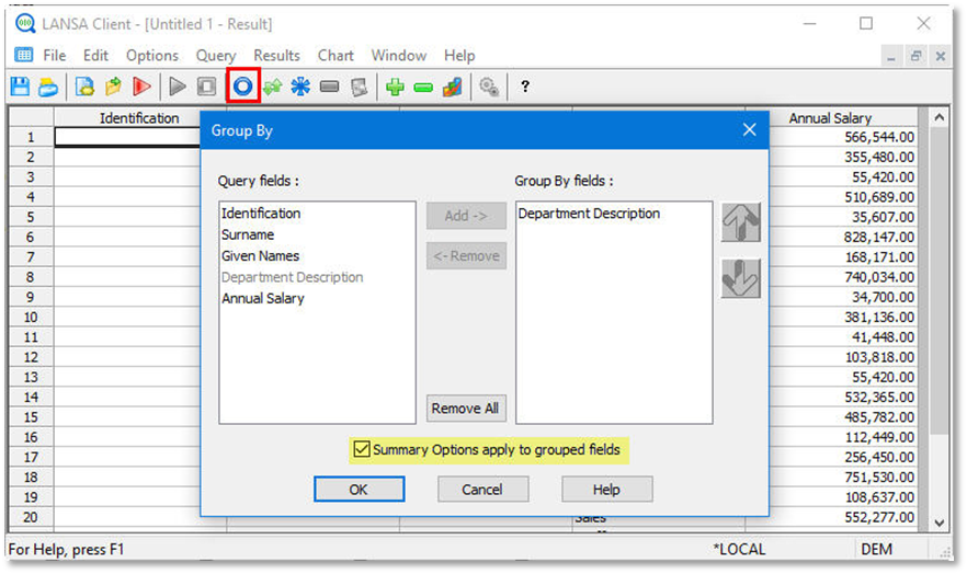 2.  Apply the Summary options to your grouped fields while you stay positioned in the Results window.