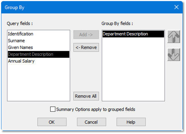 2.  From the Group By dialog box, add Department Description to the Group By fields list.