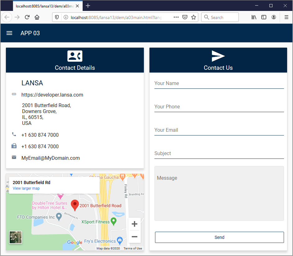 問い合わせビューは、問い合わせ先の詳細、地図上に印をつけた組織の住所、SMSやEメールでのやりとりが可能かどうかを表示します。